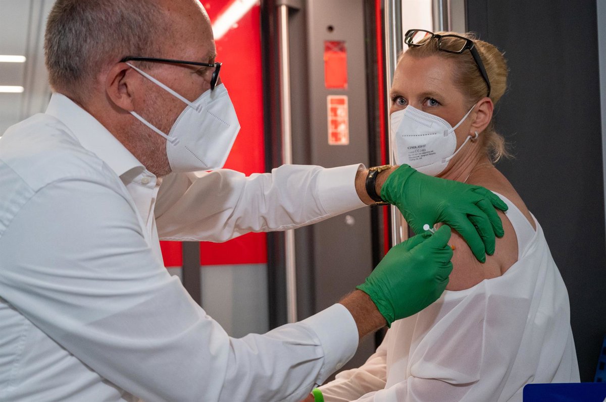Archivo - FILED - 30 August 2021, Berlin: Christian Gravert, chief medical officer of Deutsche Bahn, vaccinates a woman in a special train of the S-Bahn, in which vaccinations with the vaccine of the manufacturer Johnson & Johnson are offered. The Europ - Christophe Gateau/dpa - Archivo