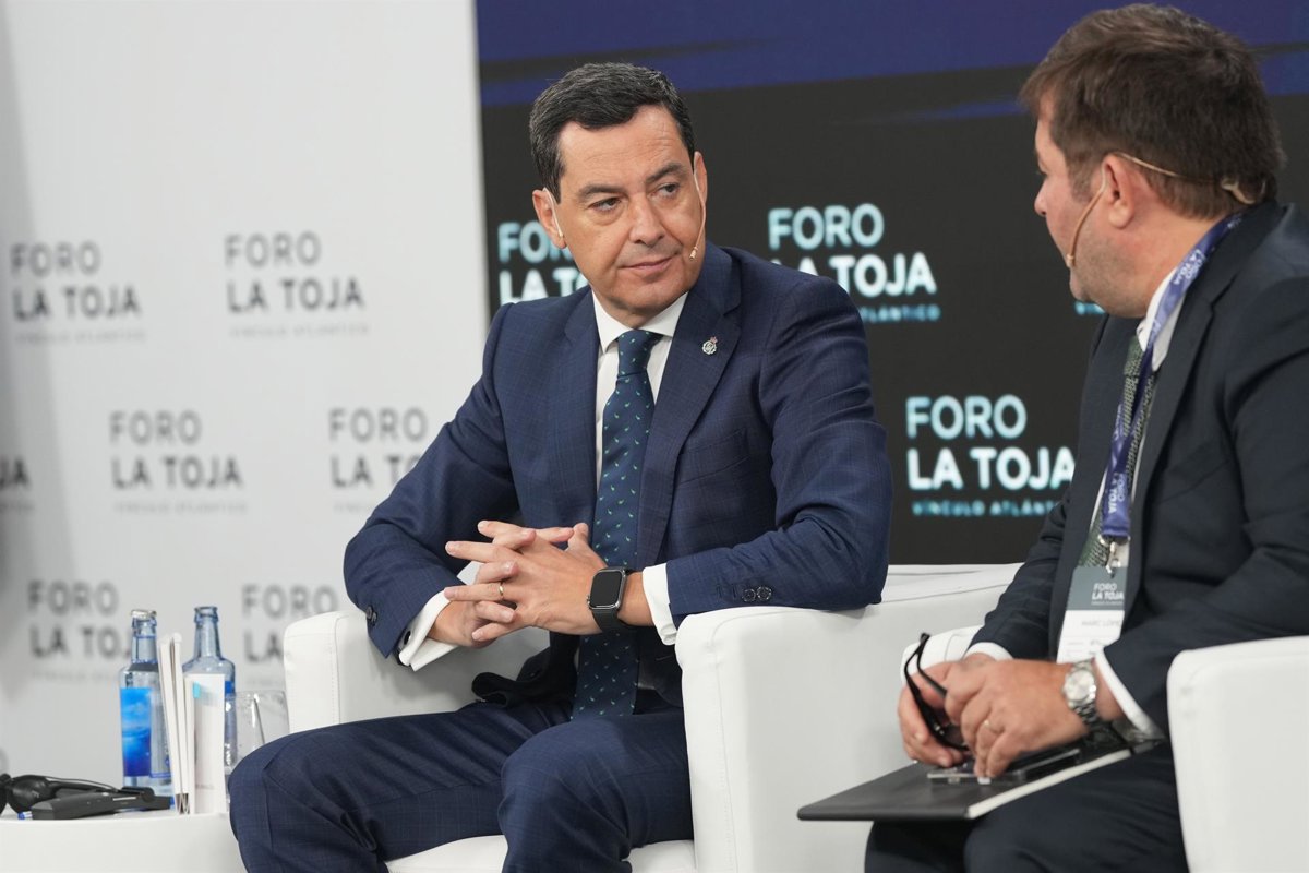 El presidente de la Junta de Andalucía, Juanma Moreno, este viernes, en una mesa redonda sobre política europea en el marco del VII Foro La Toja-Vínculo Atlántico, en Grove (Pontevedra) - JUNTA DE ANDALUCÍA