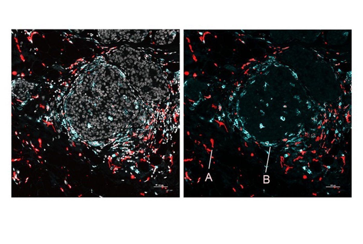 Imagen de células de cáncer de mama humano que muestra A) macrófagos inmunosupresores cerca del tejido conjuntivo tumoral, y B) macrófagos inmunoestimuladores cerca de los nidos tumorales. - NIR BEN CHETRIT