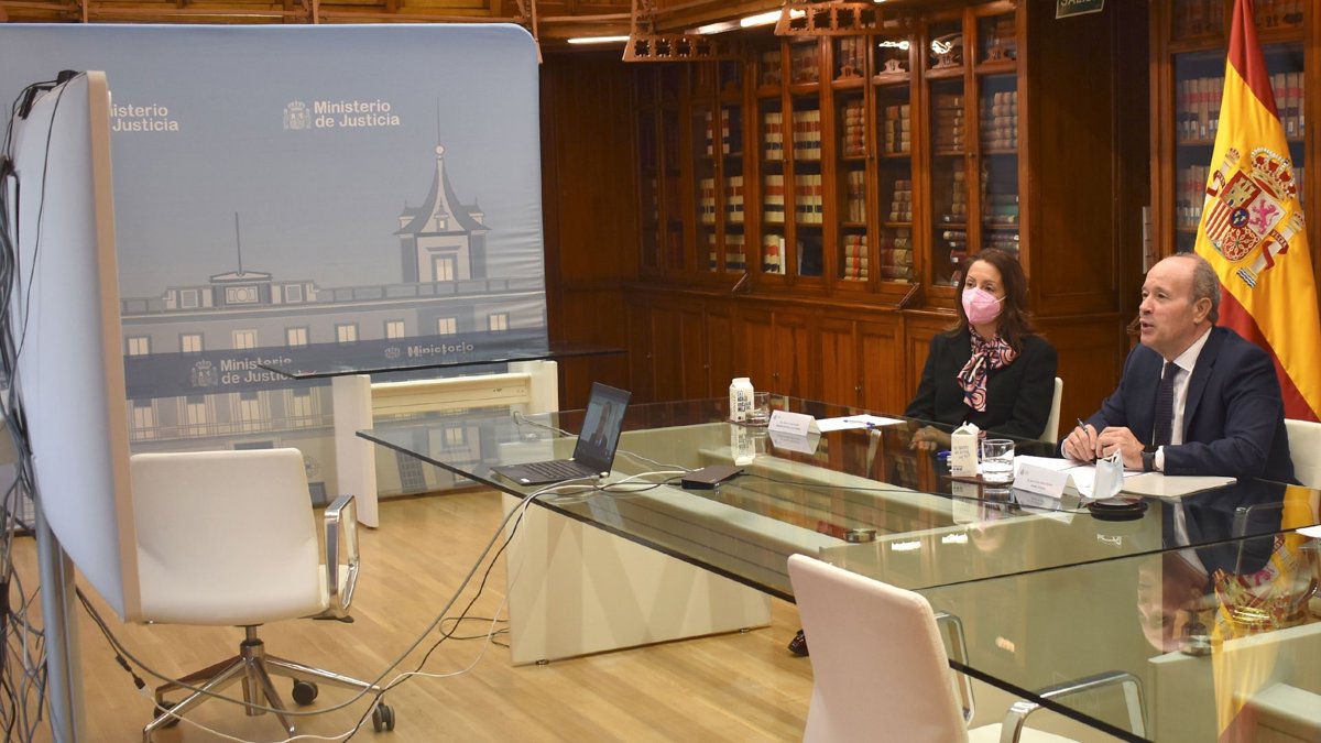 El ministro de Justicia, Juan Carlos Campo, presenta a la magistrada de enlace en Bélgica, Paloma Conde-Pumpido, en una reunión telemática con su homólogo belga, Vicent Van Quickenborne. - MINISTERIO DE JUSTICIA