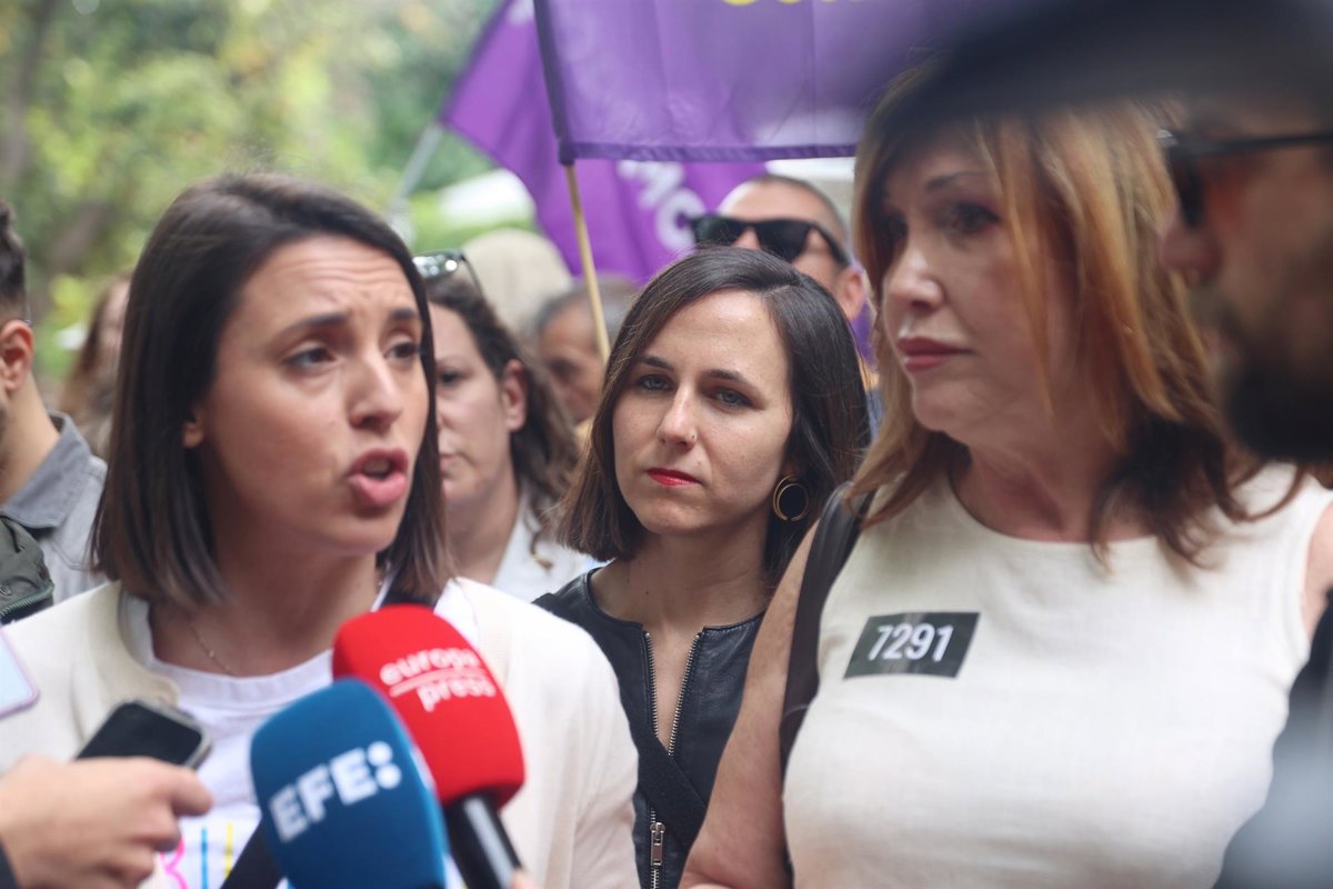 Archivo - (I-D) La secretaria Política de Podemos y candidata del partido a las elecciones europeas, Irene Montero, la secretaria general de Podemos, Ione Belarra, y la activista y presidenta de la Federación Plataforma Trans, Mar Cambrollé, atienden a lo - Ricardo Rubio - Europa Press - Archivo