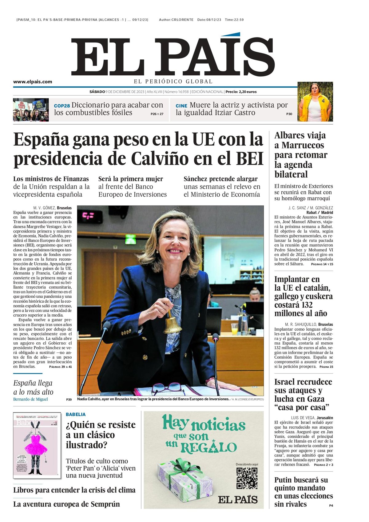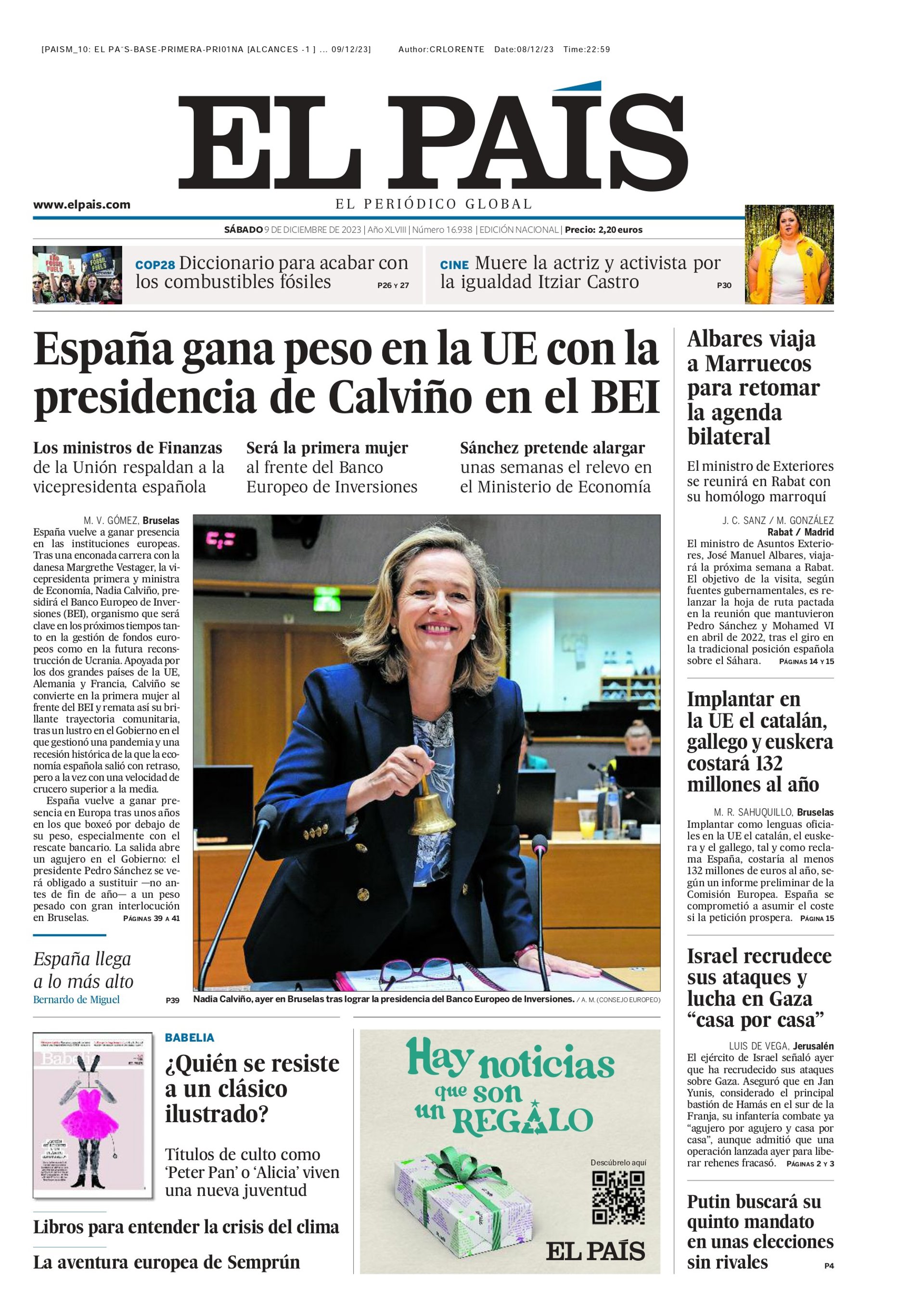 Portada de El País del sábado 9 de diciembre de 2023 - EL PAIS