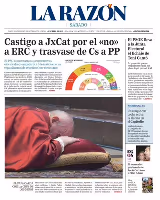 LA RAZÓN: "Castigo a JxCat por el 'no' a ERC y trasvase de Cs a PP"; "El PSOE lleva a la Junta Electoral el fichaje de Toni Cantó"; "Un ataque con coche activa la alarma en el Capitolio"; "El Papa carga con la cruz de los niños".