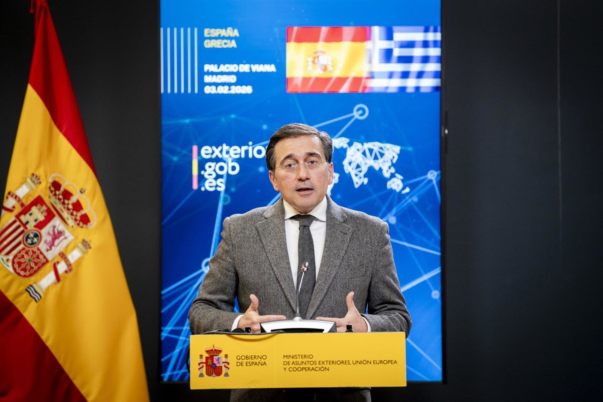 El ministro de Asuntos Exteriores, Unión Europea y Cooperación, José Manuel Albares, ofrece una rueda de prensa tras reunirse con su homólogo griego, Georgios Gerapetritis, a 3 de febrero de 2026, en Madrid (España). - A. Pérez Meca - Europa Press