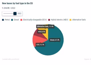 En cuanto a los combustibles alternativos, que incluyen el gas natural, el gas licuado de petróleo (GLP), los biocombustibles y el etanol, en la UE se matricularon un total de 3.262 autobuses de este tipo, un 8% más que en 2021.