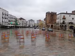 Sillas vacías en la Plaza Mayor de Cáceres en recuerdo de las mujeres asesinadas por violencia de género este año - EUROPA PRESS