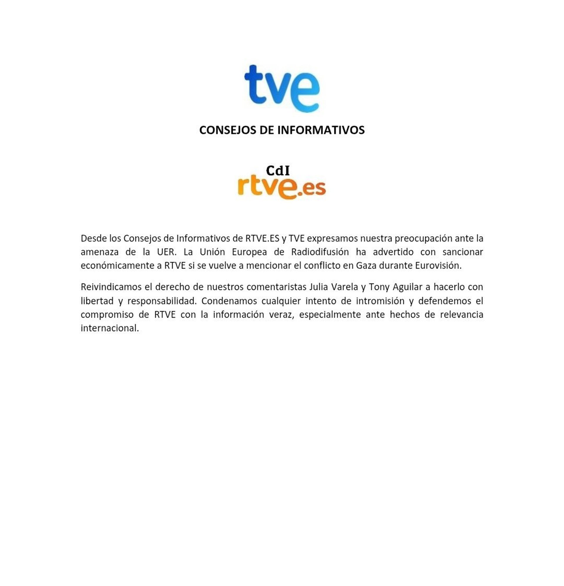 "Desde los Consejos de Informativos de rtve.es y TVE expresamos nuestra preocupación ante la amenaza de la UER. La Unión Europea de Radiodifusión ha advertido con sancionar económicamente a RTVE si se vuelve a mencionar el conflicto en Gaza durante Eurovisión", ha publicado en su cuenta de red social X el Consejo de Informativo de TVE junto a un comunicado, pasadas las 22.00 horas.