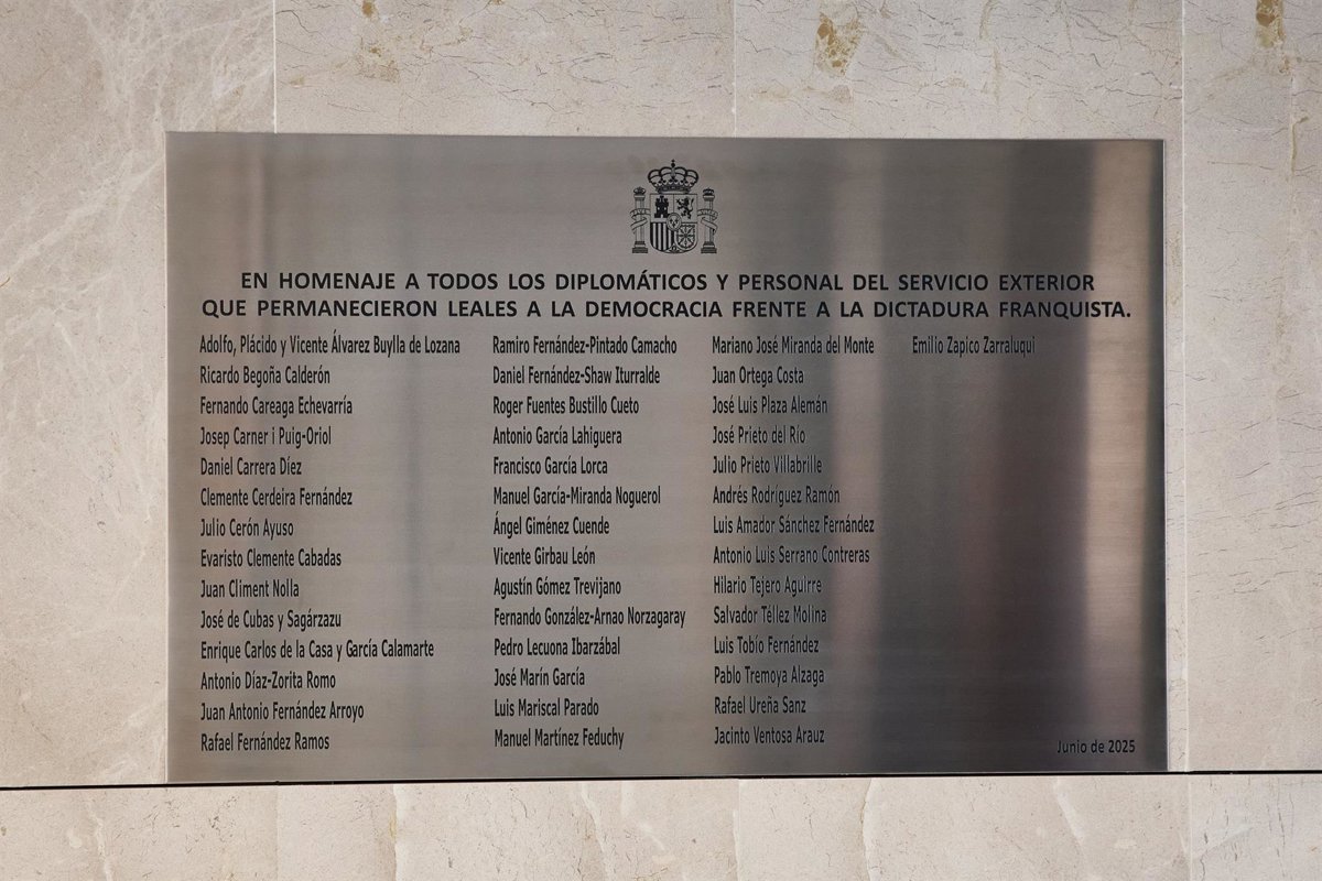 Una placa con los nombres de algo más de 40 diplomáticos que permanecieron leales a la República tras la llegada del Franquismo recibirá a partir de este lunes a quienes entren a la sede del Ministerio de Asuntos Exteriores, Unión Europea y Cooperación en la madrileña Plaza de Marqués de Salamanca.