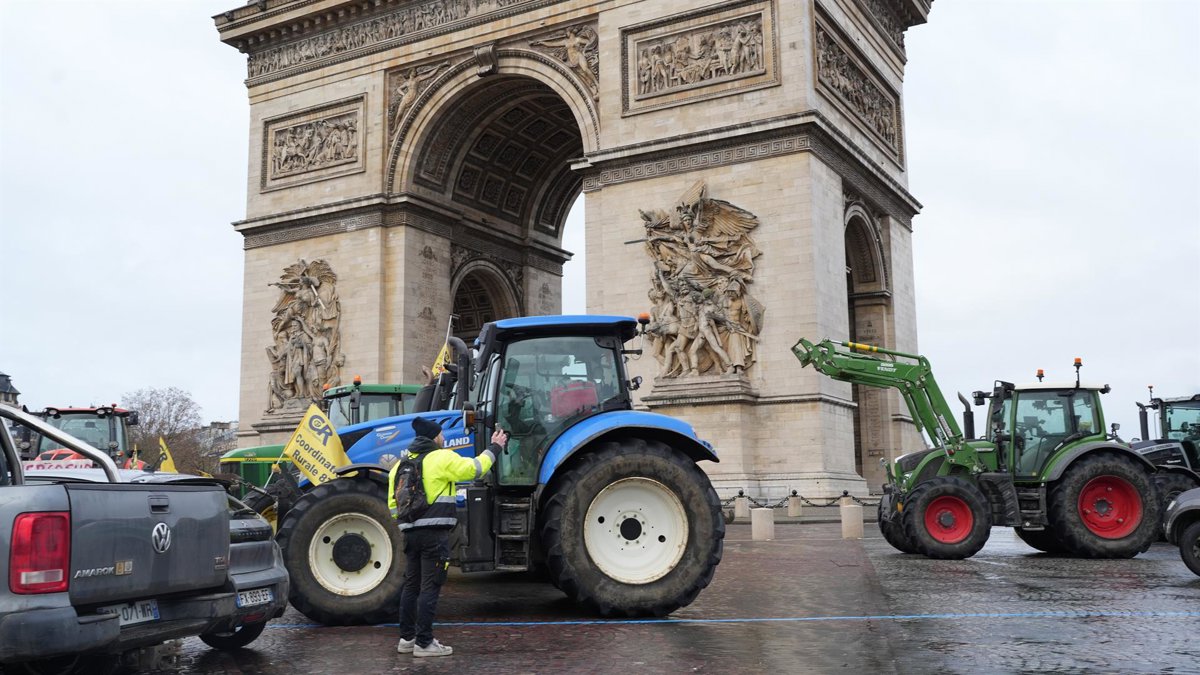Varios tractores frente al Arco del Triunfo, a 8 de enero de 2026, en París (Francia). Sobre un centenar de tractores han entrado en la capital francesa, pese a los intentos para impedirlo de las Fuerzas de Seguridad del Estado, para protestar contra el a - Ana López