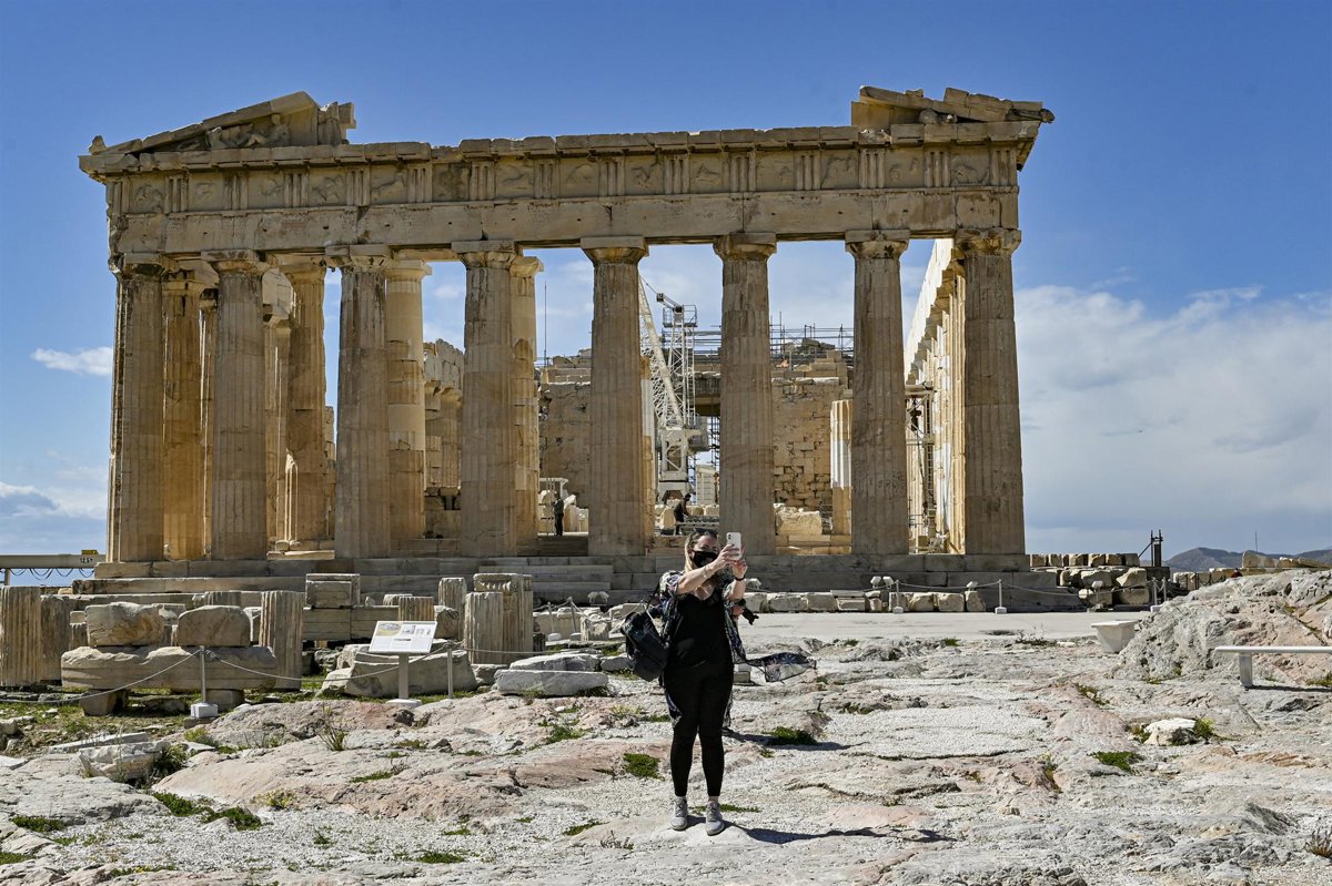 Un visitante tomándose un selfie en el Partenón - MILOS BICANSKI/GETTY IMAGES)