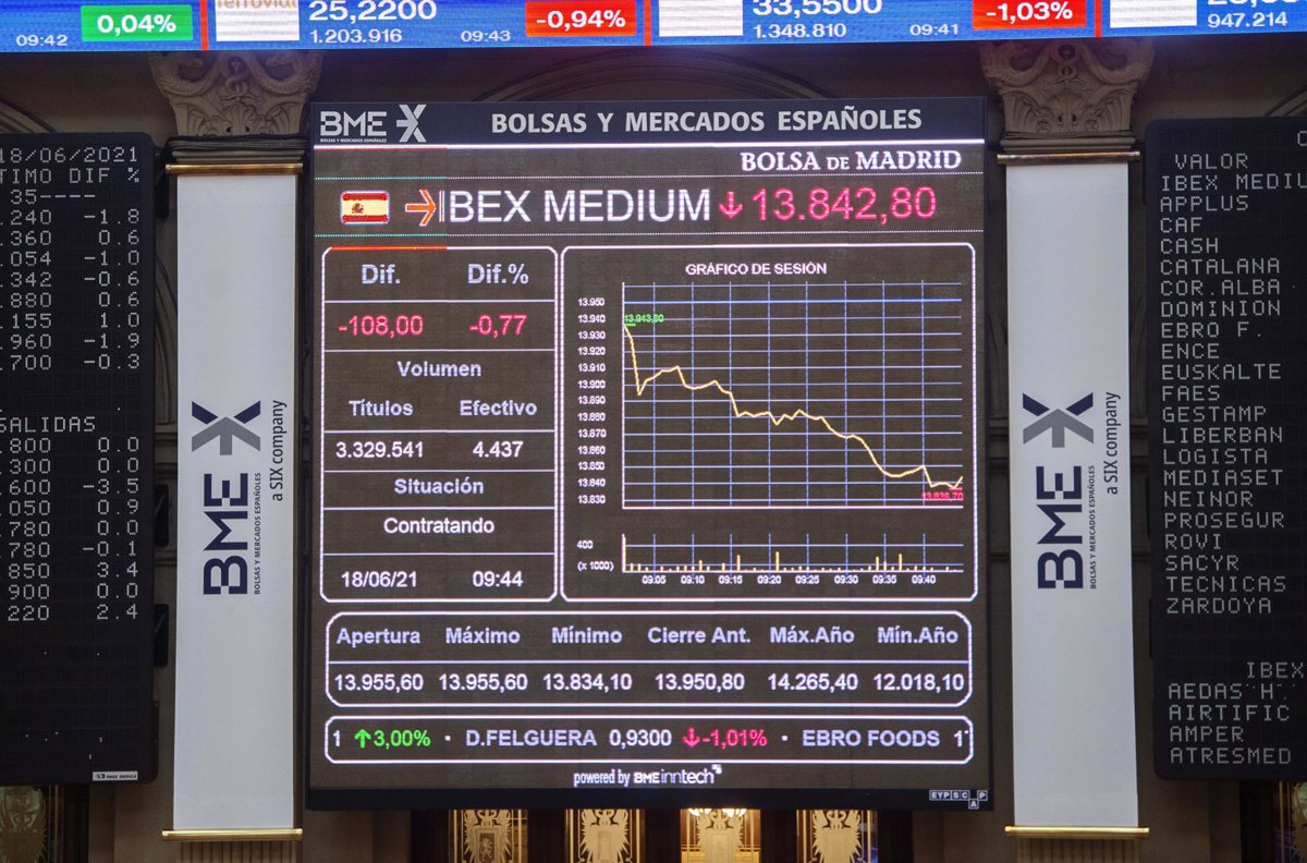 Archivo - Valores del Ibex 35 en los paneles del Palacio de la Bolsa de Madrid, a 18 de junio de 2021, en Madrid, (España). El Ibex 35 ha iniciado la sesión de este viernes con una caída del 0,68%, lo que ha llevado al selectivo a situarse en los 9.133 en - Alberto Ortega - Europa Press - Archivo
