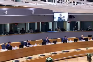 HANDOUT - 24 February 2022, Belgium, Brussels: Ukrainian President Volodymyr Zelensky speaks via video conference during the Special meeting of the European Council on the situation in Ukraine. Photo: Dario Pignatelli/EU Council/dpa - ATTENTION: editori - Dario Pignatelli/EU Council/dpa