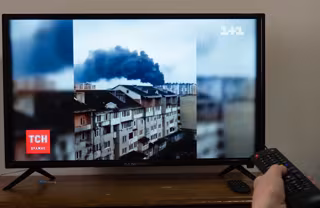 24 February 2022, Ukraine, Kiev: A person points the remote at a television screen showing news reports on the shelling of the airport in Ivano-Frankivsk in thde wake of the Russian invasion of Ukraine. Photo: Igor Golovniov/SOPA Images via ZUMA Press Wir - Igor Golovniov/SOPA Images via Z / DPA