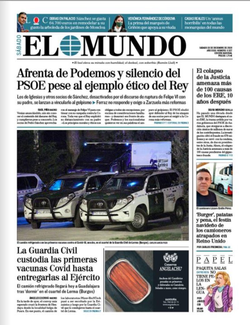 EL MUNDO: "Afrenta de Podemos y silencio del PSOE pese al ejemplo ético del Rey"; "El colapso de la Justicia amenaza más de 100 causas de los ERE, 10 años después"; "La Guardia Civil custodia las primeras vacunas Covid hasta entregarlas al Ejército".