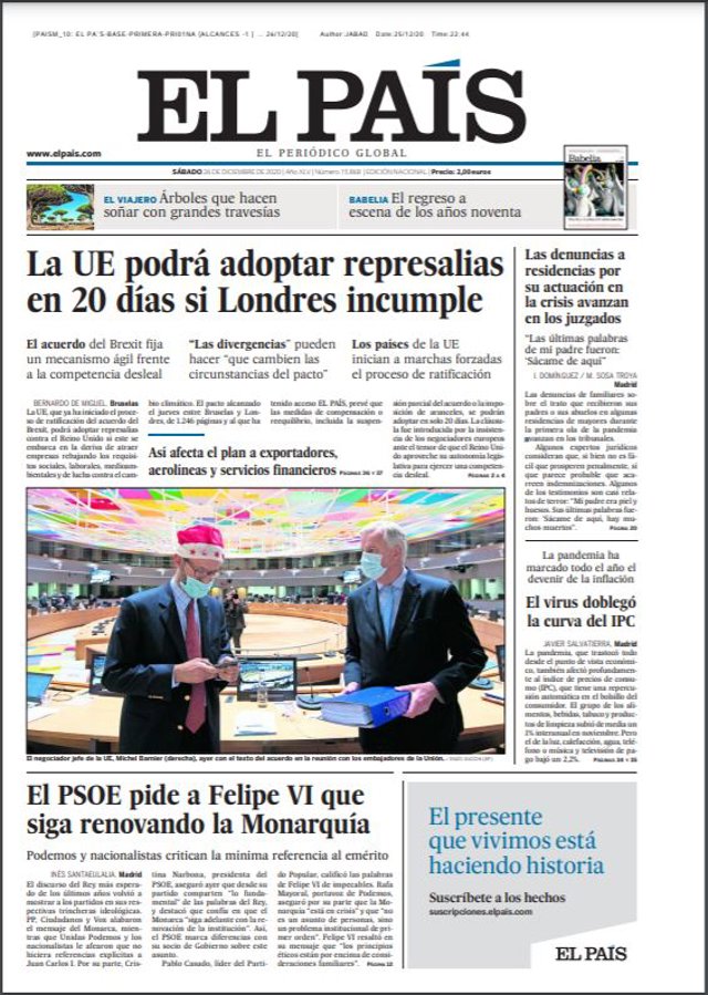 EL PAÍS: "La UE podrá adoptar represalias en 20 días si Londres incumple"; "Las denuncias a residencias por su actuación en la crisis avanzan en los juzgados"; "El PSOE pide a Felipe VI que siga renovando la Monarquía"; "El virus doblegó la curva del IPC".