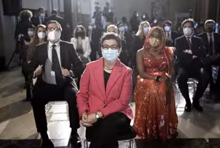 (I-D) El presidente de la CEOE, Antonio Garamendi; la ministra de Asuntos Exteriores, Unión Europea, Cooperación, Arancha González Laya y la cantante cubana Lucrecia, como ejemplo de la cultura y la solidaridad durante la presentación de una nueva entre - Óscar Cañas - Europa Press