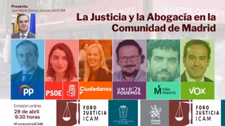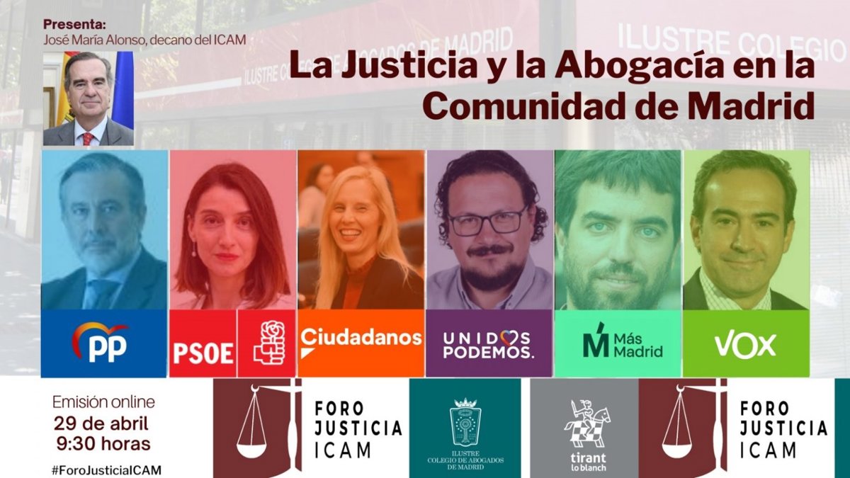 Representantes de los partidos políticos que concurren a las elecciones del próximo 4 de mayo han confrontado este jueves en un encuentro digital en el Colegio de Abogados de Madrid (ICAM) sus propuestas en materia de Justicia, discrepando en lo relativo a la financiación de la Ciudad de la Justicia por la sombra de la corrupción pero encontrando puntos de encuentro en aspectos relativos a la digitalización, mediación y actualización de baremos del turno de oficio.