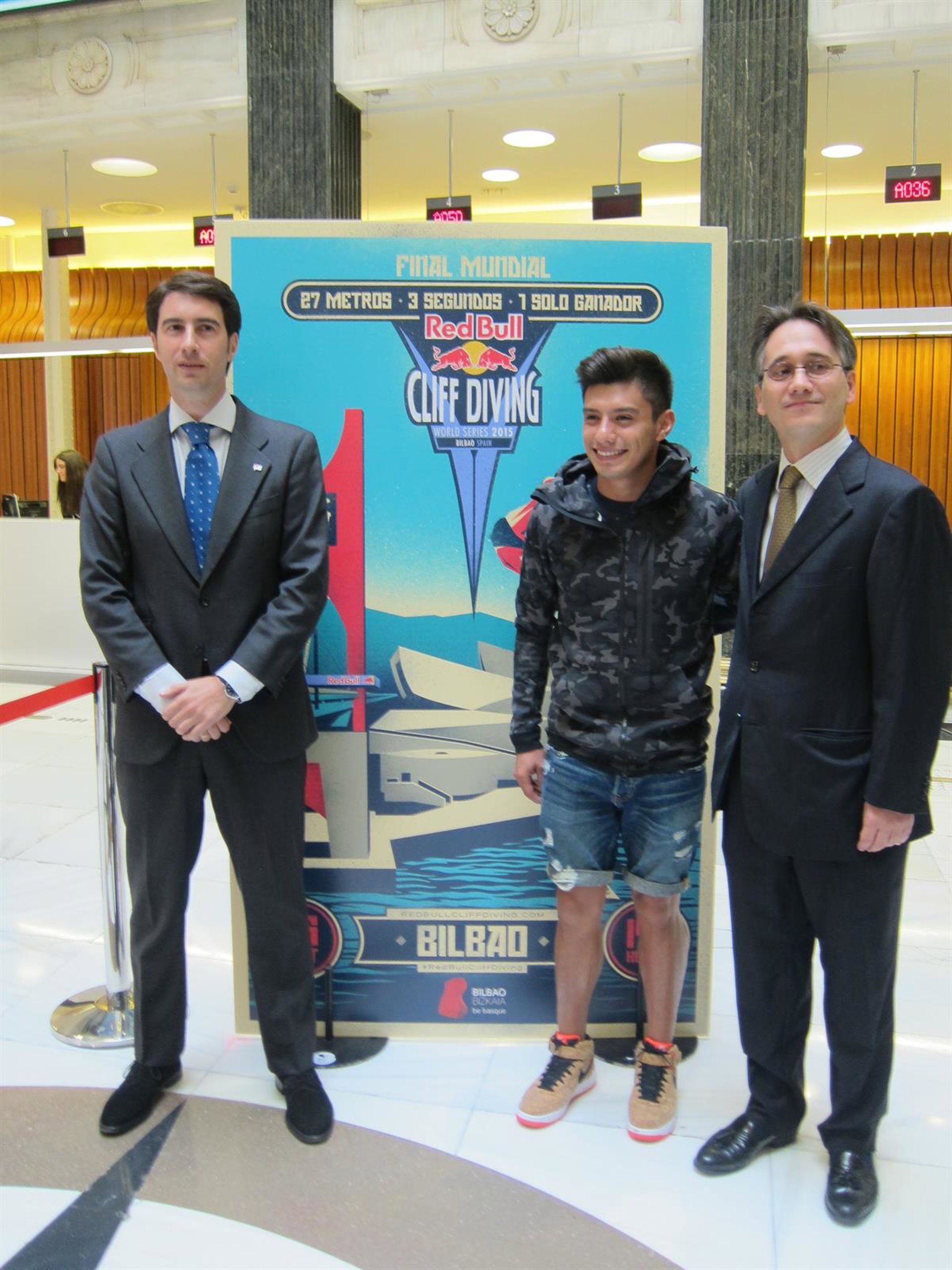 El concejal de Desarrollo Económico, Comercio y Empleo de Bilbao, Xabier Ochandiano, junto con el director de Turismo de la Diputación foral de Bizkaia, Asier Alea, y Jonathan Paredes, uno de los saltadores con mejor ejecución técnica en el mundo del 'cliff diving' y ganador de la clasificatoria celebrada en Cartagena (Colombia), han presentado este viernes la Gran Final 'Red Bull Cliff Diving World Series 2015', que reunirá en la capital vizcaína a miles de personas aficionadas y congregará a más de 60 medios de comunicación de todo el mundo