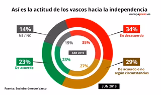 Es en este último territorio donde más están de favor de la independencia, el 26%, seguido de Vizcaya, con un 23%, y solo un 15% de los alaveses son favorables a esta opción. En cuanto a la gente que no se decanta y que señala que estaría de acuerdo o no con la secesión dependiendo de las circunstancias, se situaría en un 34% en Guipúzcoa, en un 29% en Vizcaya y en un 22% en Álava.