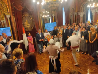 Los bailes tradicionales han dado inicio a una recepción repleta de personalidades del ámbito institucional, entre ellos el consejero vasco de Seguridad, Bigen Zupiria, la diputada general, Elixabete Etxanobe, y la presidenta de las Juntas Generales de Bizkaia, Ana Otadui, así como representantes del ámbito cultural, social y empresarial.