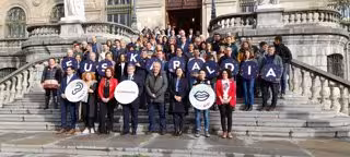 Foto de la corporación y personal municipal del Ayuntamiento de Bilbao en apoyo a Euskaraldia . - EUROPA PRESS