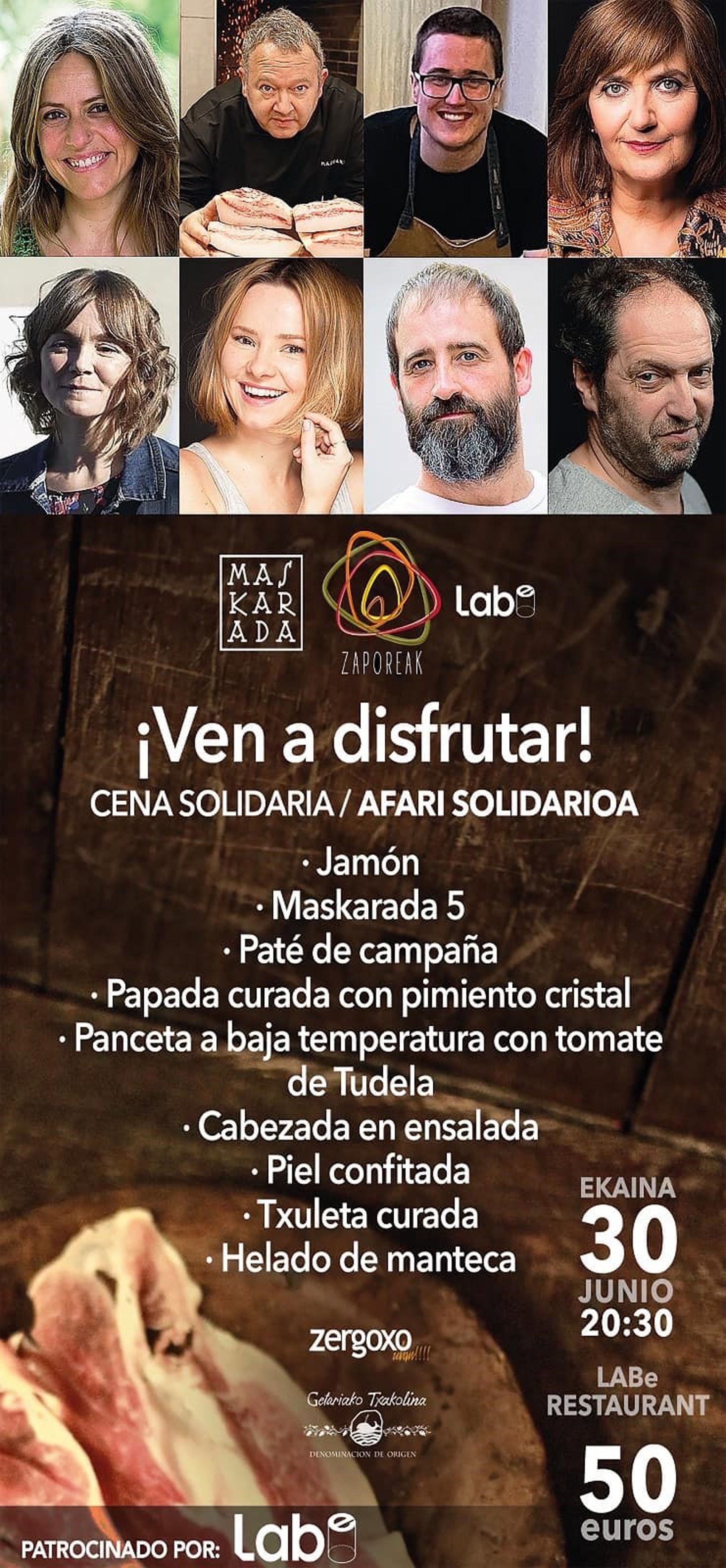 Actores y actrices vascos como Itziar Ituño o Josean Bengoetxea servirán la cena solidaria organizada por la ONG Zaporeak, Maskarada, y el restaurante LABe este viernes en Tabakalera de San Sebastián. Los fondos recaudados se destinarán al proyecto de Zaporeak en la isla griega de Lesbos donde diariamente reparte más de dos mil comidas entre las personas refugiadas.