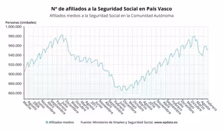 Gráfico de la evolución de la afiliación a la Seguridad Social en Euskadi - EPDATA