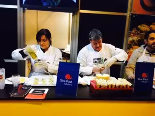 Además, los cocineros de la asociación Slow Food Álava han ofrecido al público de Fitur dos pintxos elaborados con materia prima cien por cien alavesa: 'Cucurucho de flor de queso Artzai-Gazta con miel del Gorbea' y 'Capricho de patata Gorbea, aceite de Rioja Alavesa y sal de Añana'.
