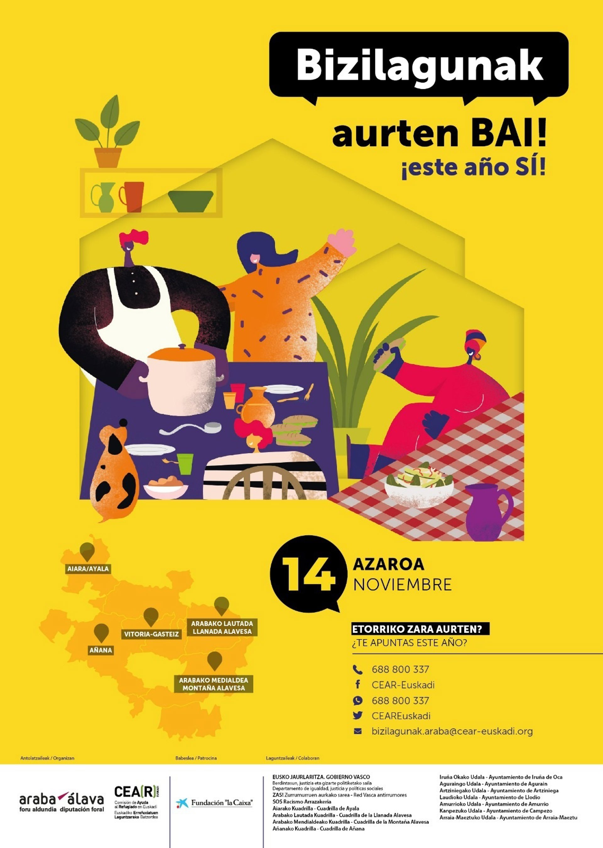 En su última edición más de 1.000 personas de 44 nacionalidades diferentes se sumaron a la iniciativa en Álava. Las comidas se llevarán a cabo este año en Santa Cruz de Campezo, Arraia-Maeztu, Amurrio, Laudio, Artziniega, Nanclares, Salvatierra-Agurain y Vitoria-Gasteiz. La inscripción finaliza el 31 de octubre.