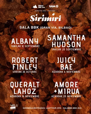 Albany y Samantha Hudson inaugurarán la programación de Sirimiri este mes de septiembre de la mano de Bilbao BBK Live y BBK y Robert Finley, Juicy BAE, Queralt Lahoz y AMORE+Mirua serán los siguientes nombres en pasar por el ciclo de conciertos que continuará hasta el 20 de noviembre en la Sala BBK, según ha informado Last Tour.