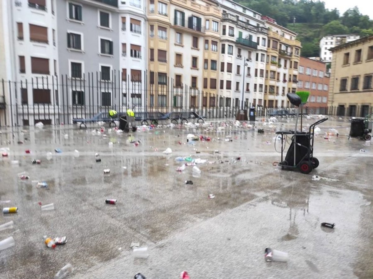 Imagen de una plaza de Eibar con restos de un botellón - JON IRAOLA