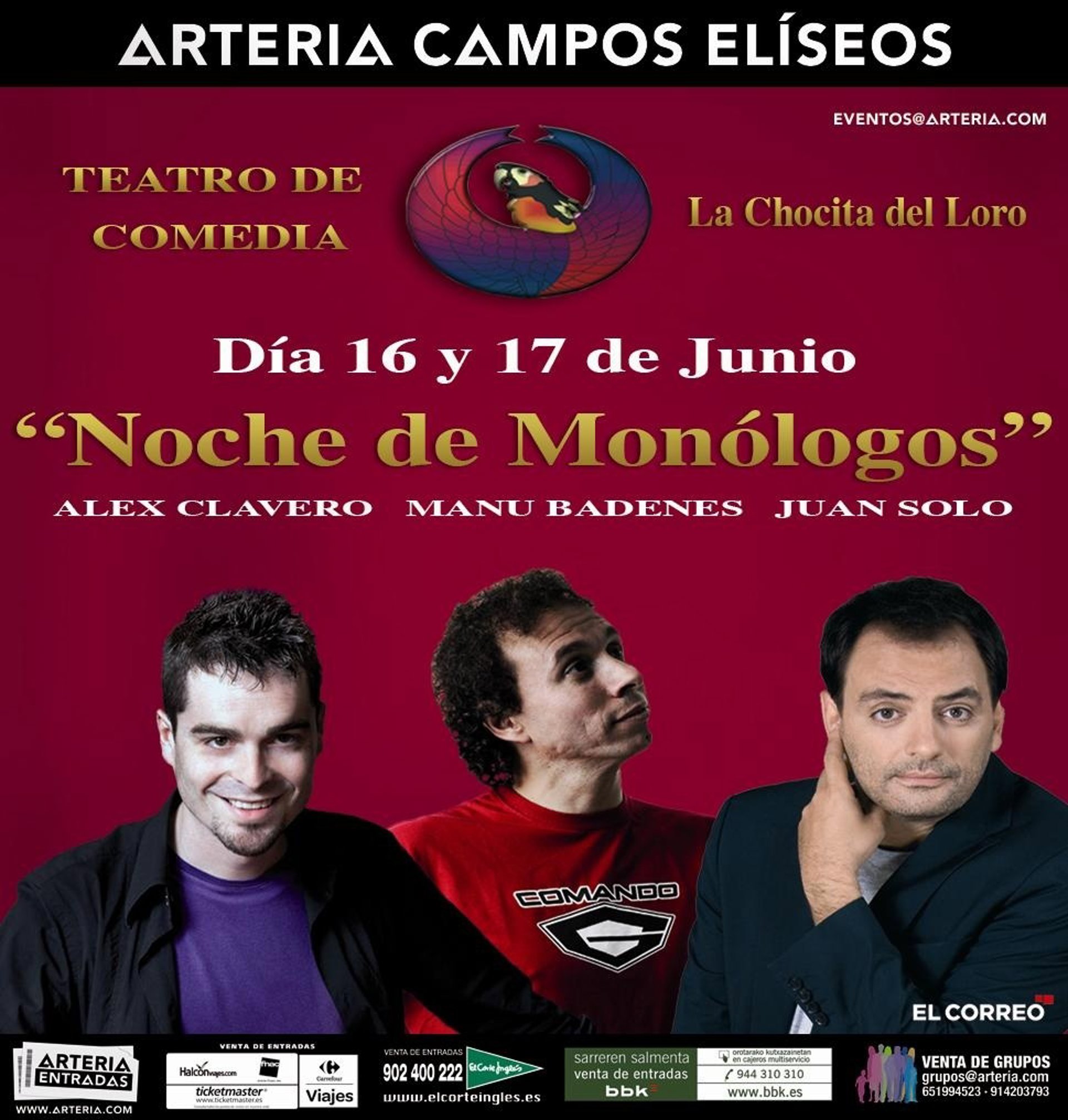El Arteria Teatro Campos de Bilbao acogerá este jueves y viernes sus 'Noches de Monólogos' que, en esta ocasión, contarán con la participación de Alex Clavero, Manu Badenes y Juan Solo.