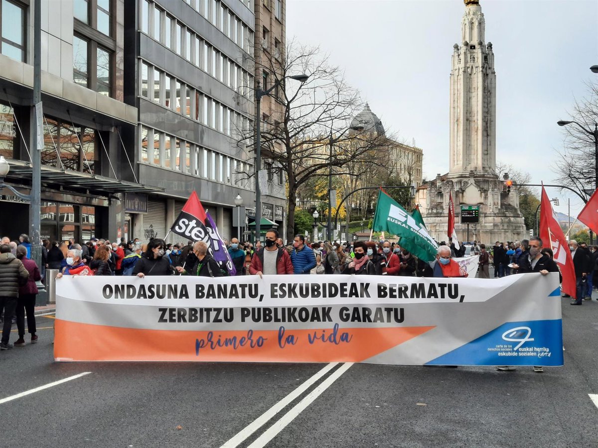 La marcha de Bilbao ha estado encabezada por una pancarta con el texto 'Ondasuna banatu, Eskubideak bermatu, Zerbitzu publikoak garatu. Primero la vida', portada, entre otros, por los secretario generales de ELA, Mitxel Lakuntza, y de LAB, Garbiñe Aranburu.