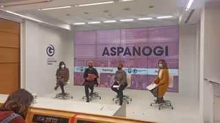 En rueda de prensa en la Diputación de Gipuzkoa, la diputada foral de Políticas Sociales, Maite Peña, la edil donostiarra de Bienestar Social, Aitziber San Román, la presidenta de Aspanogi, Nerea Goikoetxea, y la trabajadora social de la asociación Nekane Lekuona, han presentado los actos organizados con motivo del Día internacional del niño con cáncer y la IX Marcha Nórdica Solidaria de Aspanogi.