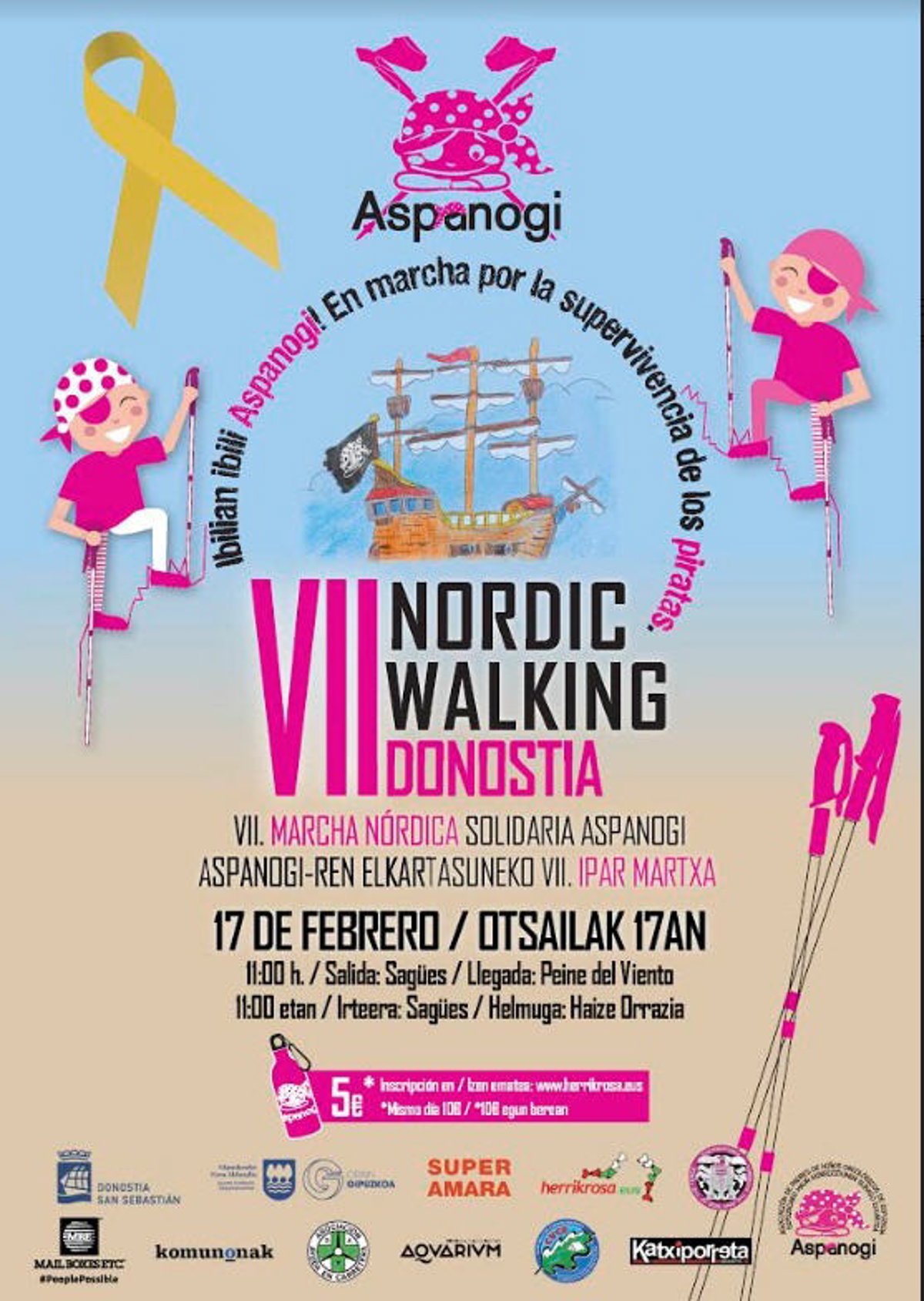 La Asociación de Padres de Niños Oncológicos de Gipuzkoa, Aspanogi, ha organizado para este domingo en San Sebastián la séptima edición de la Nordic walking (marcha nórdica) solidaria con el objetivo de concienciar sobre el cáncer infantil. La iniciativa recorrerá las tres playas de la capital guipuzcoana bajo el lema 'Aspanogi XX años caminando por los piratas'.