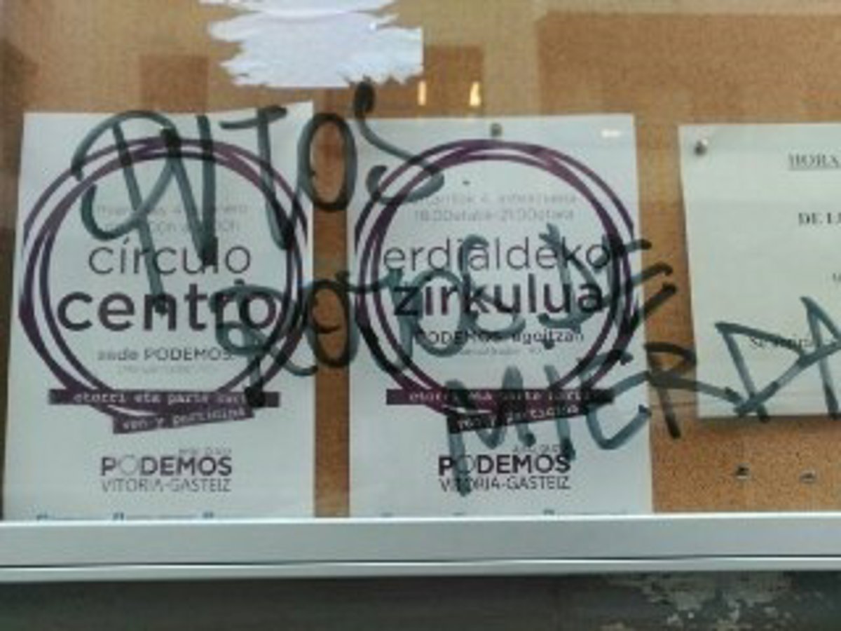 En la sede de Podemos en Vitoria han aparecido pintadas en las que podía leerse 'putos rojos de mierda' y 'putos terroristas'. Según ha recordado este partido a través de un comunicado, el ataque se produce dos semanas después de que en el coche de su concejal Jorge Hinojal apareciera una pintada en la que se le calificaba de 'puto rojo'.