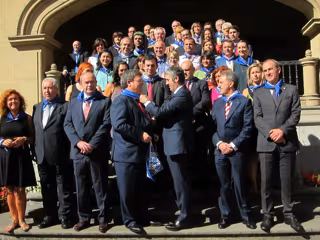 El regidor y el máximo mandatario rojiblanco se han colocado al cuello sendos pañuelos de la Semana Grande, tras lo cual los corporativos han irrumpido en aplausos.