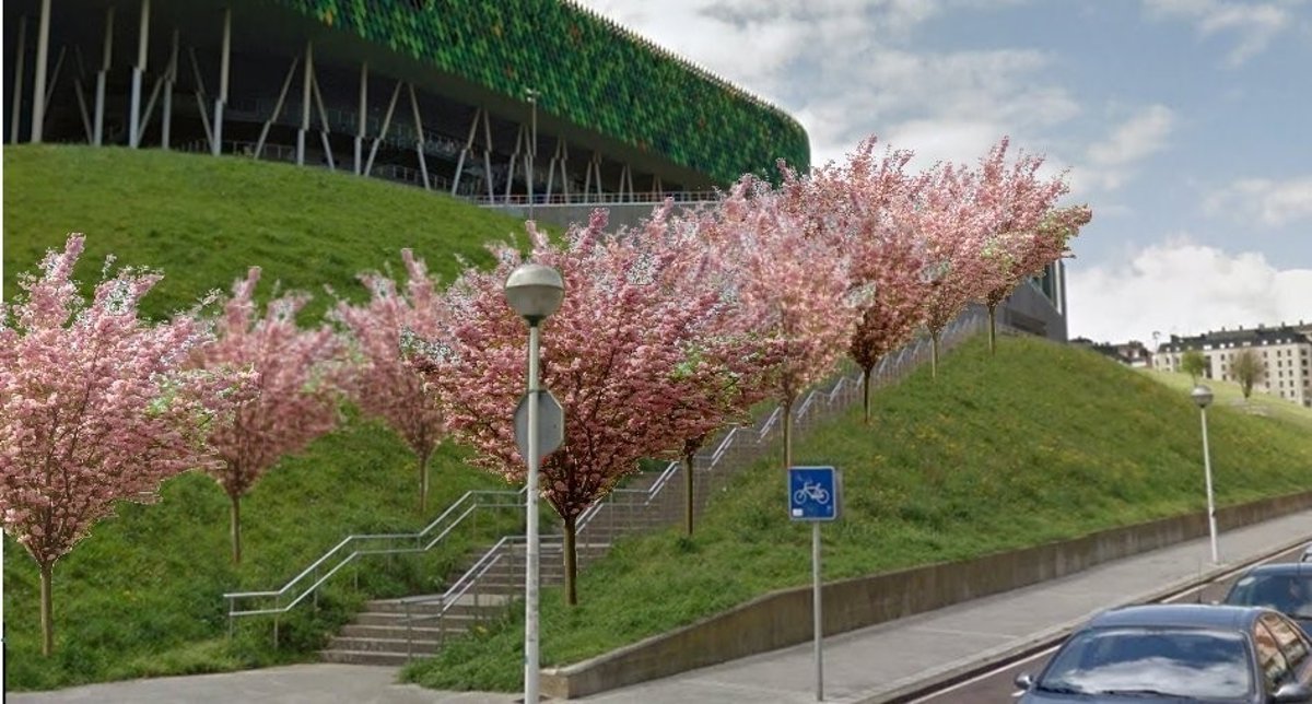 El Ayuntamiento de Bilbao ha procedido a la plantación de 32 árboles en los taludes del Bilbao Arena, en el barrio de Miribilla. Se trata de distintas especies arbóreas, algunas de hoja perenne -quercus ilex o encinas- y otras de floración destacada, como los prunus serrulata kanzan o cerezos japoneses.