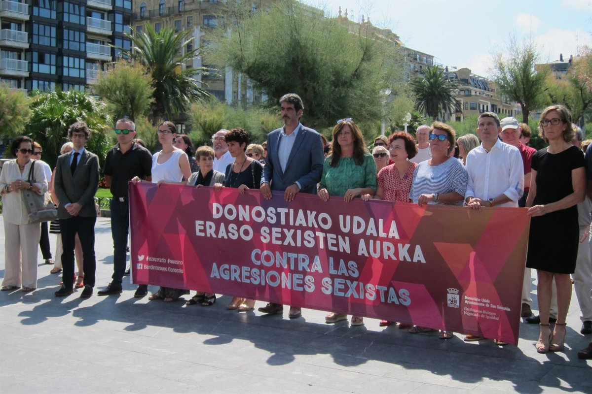 Representantes de todas las formaciones políticas con representación en el Ayuntamiento de San Sebastián, con el alcalde, Eneko Goia, al frente, se han concentrado este jueves en Alderdi Eder, acompañados de ciudadanos donostiarras, para mostrar su rechazo a las dos últimas agresiones sexuales ocurridas en la capital guipuzcoana, denunciadas durante el pasado fin de semana.