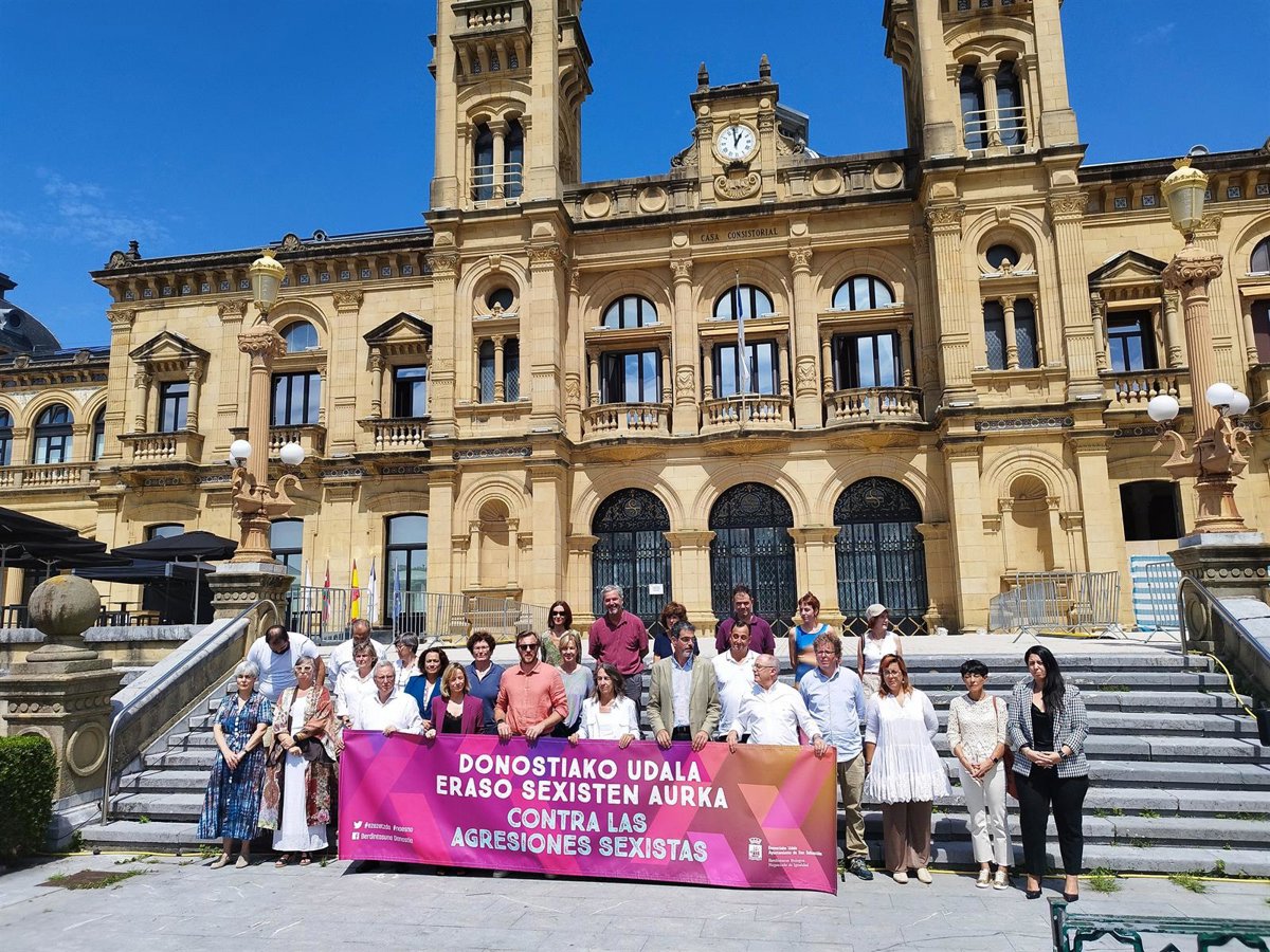 La Corporación municipal de San Sebastián se ha concentrado este viernes en los jardines de Alderdi Eder, ante el Palacio Consistorial, en repulsa por la última agresión sexual a dos mujeres registrada el pasado sábado en la ciudad, cuyo presunto autor ya ha ingresado en prisión, acusado de violación.