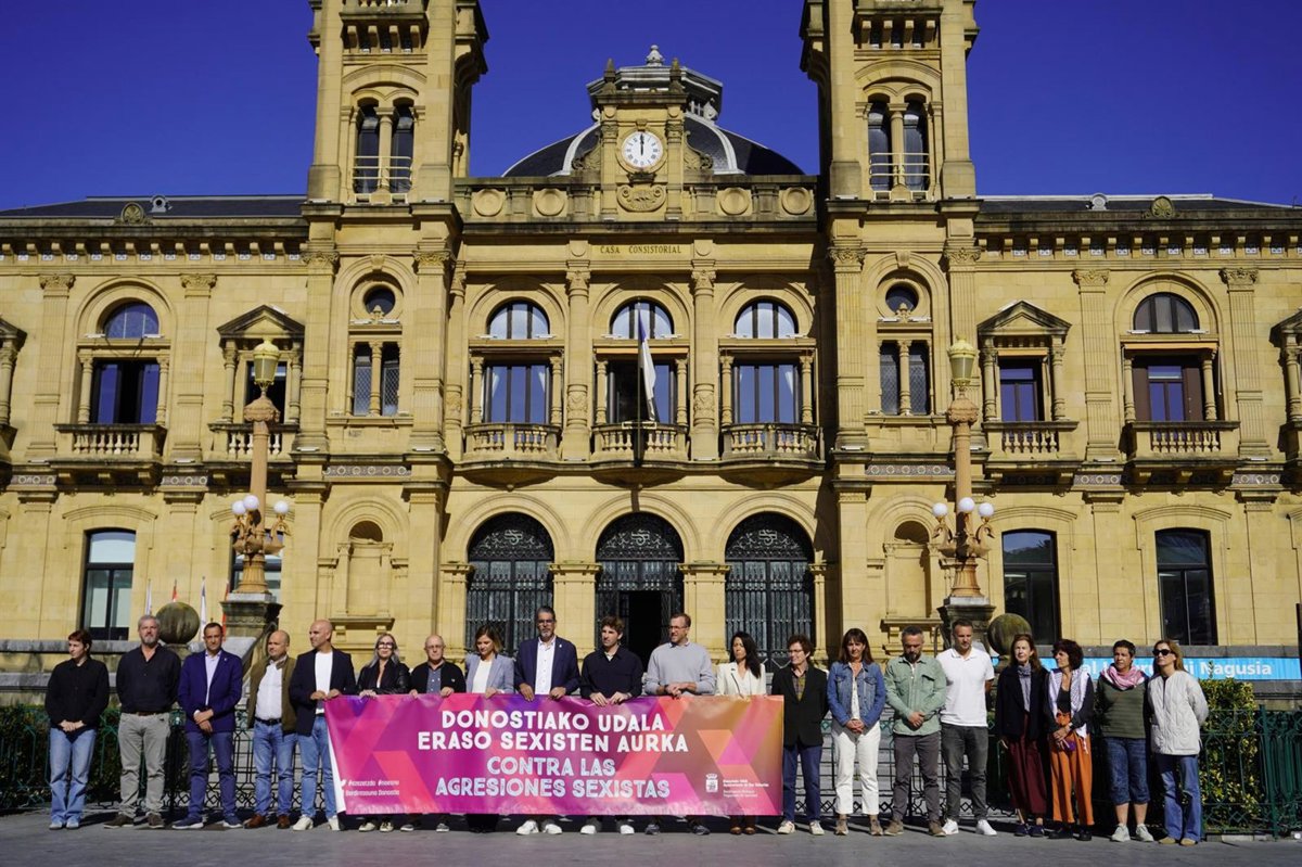 El alcalde de San Sebastián, Eneko Goia, que dejará el cargo el próximo día 16 de octubre, ha encabezado esta concentración silenciosa que se ha desarrollado a mediodía con el lema 'Contra las agresiones sexistas' en una pancarta.