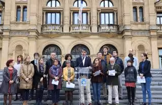 La Corporación municipal donostiarra, con el alcalde, Eneko Goia, a la cabeza, ha dado lectura este viernes en el exterior del Consistorio a una declaración en la que señala que, en el marco de su compromiso institucional con la construcción de una sociedad igualitaria libre de violencia contra las mujeres, deben "asumir el reto de incorporar el derecho a la reparación de las víctimas en la respuesta ante la violencia contra las mujeres".
