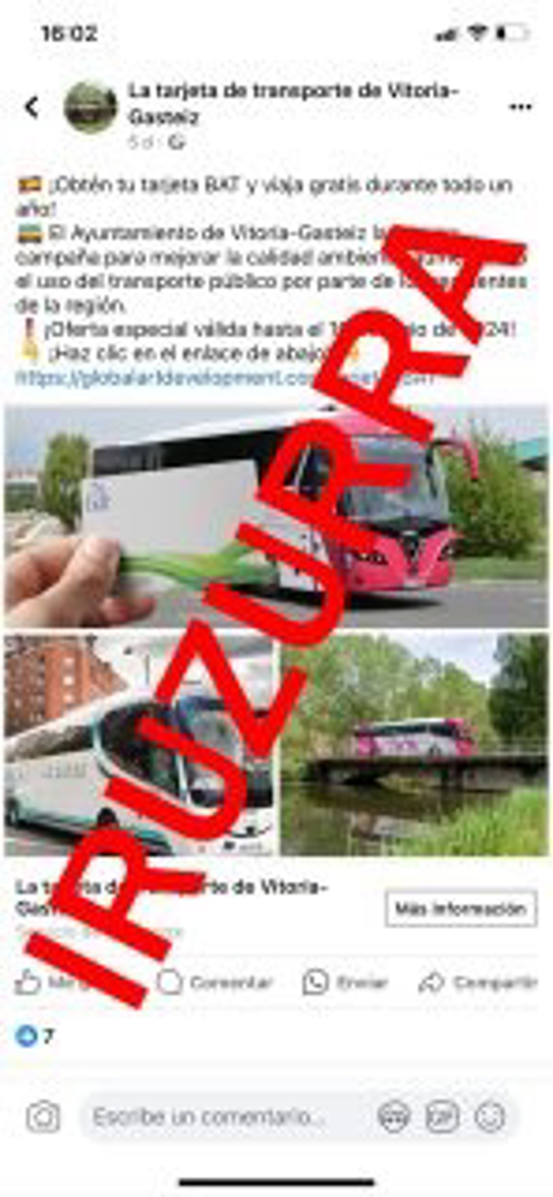 El Ayuntamiento de Vitoria-Gasteiz ha informado a las personas usuarias de la tarjeta BAT de suplantación de identidad, con el objeto de publicitar en redes sociales una oferta fraudulenta para la compra de tarjetas con un uso gratuito durante un año.