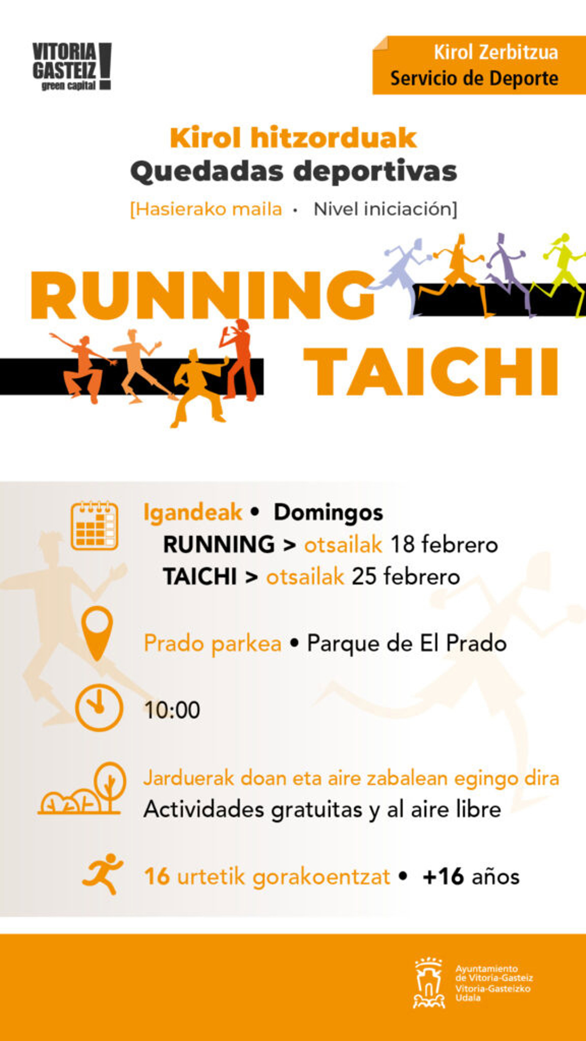 El Servicio Municipal de Deporte del Ayuntamiento de Vitoria-Gasteiz ha convocado nuevas sesiones del programa 'Quedadas Deportivas', a celebrarse durante este mes de febrero y centradas en la iniciación del 'running' y del taichí.
