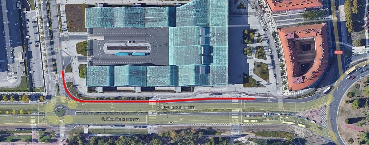 En segundo lugar, se abordará el tramo del giro hacia la calle Donostia, que da acceso a la estación de autobuses. En esta zona, el pavimento comienza a mostrar signos de agotamiento debido a los continuos frenazos, aceleraciones y maniobras de los autobuses.