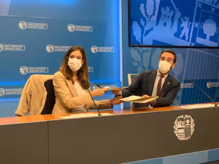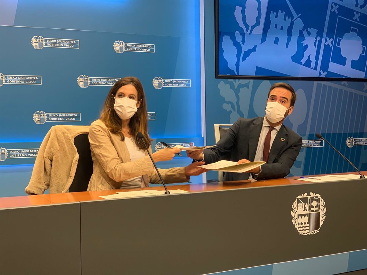 El consejero de Turismo, Comercio y Consumo, Javier Hurtado, y la teniente de alcalde y concejala de Promoción Económica, Empleo, Comercio y Turismo del Ayuntamiento de Vitoria-Gasteiz, Maider Etxebarria, han firmado este jueves el acuerdo de colaboración del Consistorio con el Departamento en la nueva edición de Euskadi Bono Denda.