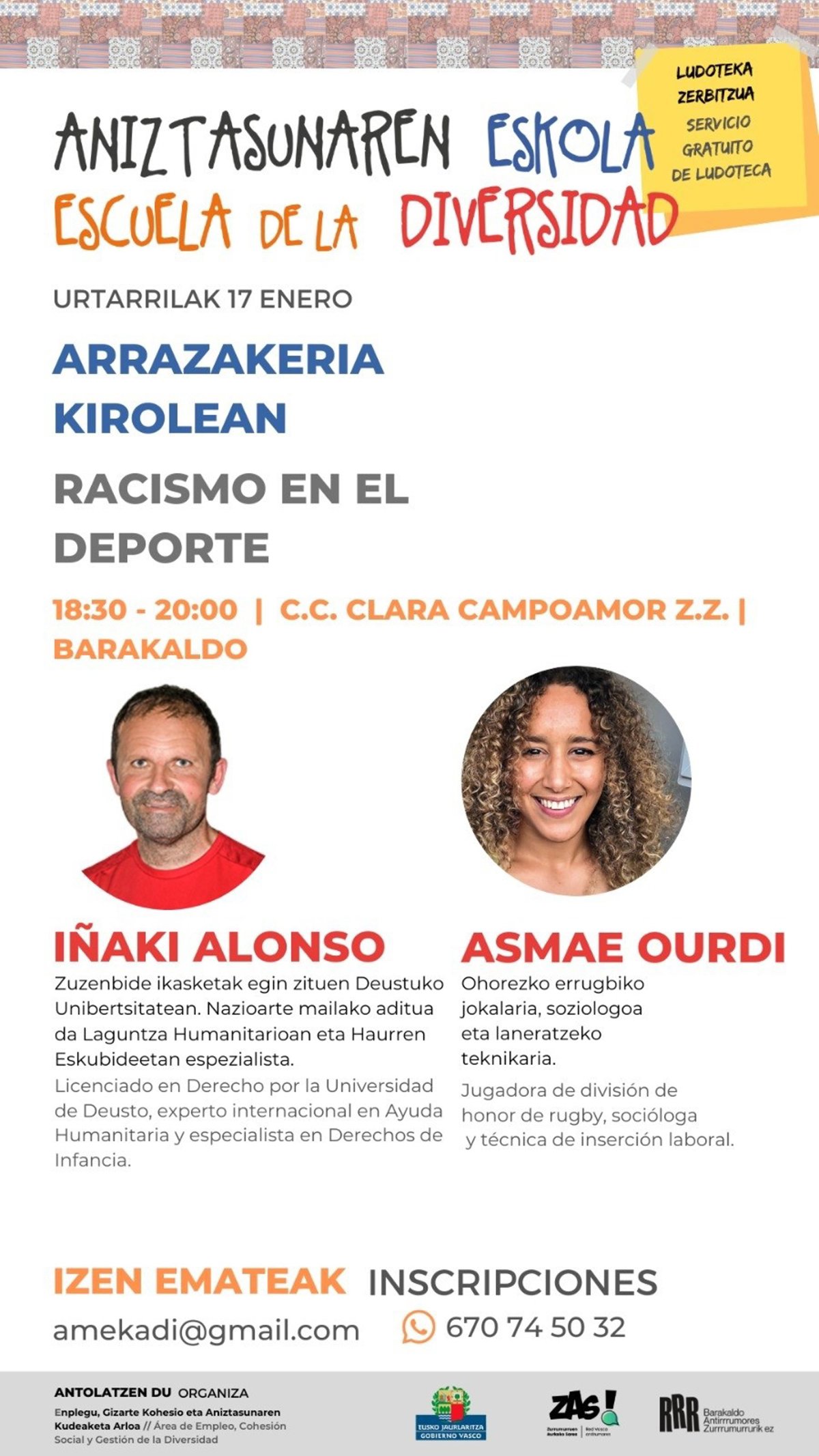 Según ha informado la concejal de Cohesión Social, Nuria Rodríguez, en el seminario intervendrán el barakaldés Iñaki Alonso, experto internacional en Ayuda Humanitaria y especialista en Derechos de Infancia, y que actualmente es responsable de Protección a la Infancia de la Fundación Athletic Club, y Asmae Ourdi, jugadora de División de Honor de Rugby, socióloga y técnico de empleo y orientación laboral.