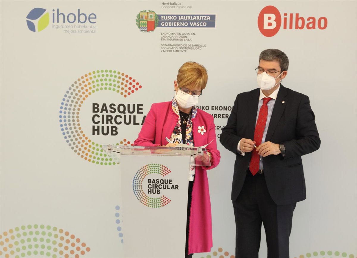 La consejera de Desarrollo Económico, Sostenibilidad y Medio Ambiente, Arantxa Tapia, y el alcalde de Bilbao, Juan Mari Aburto, en la presentación del Basque Circular Hub. - IREKIA