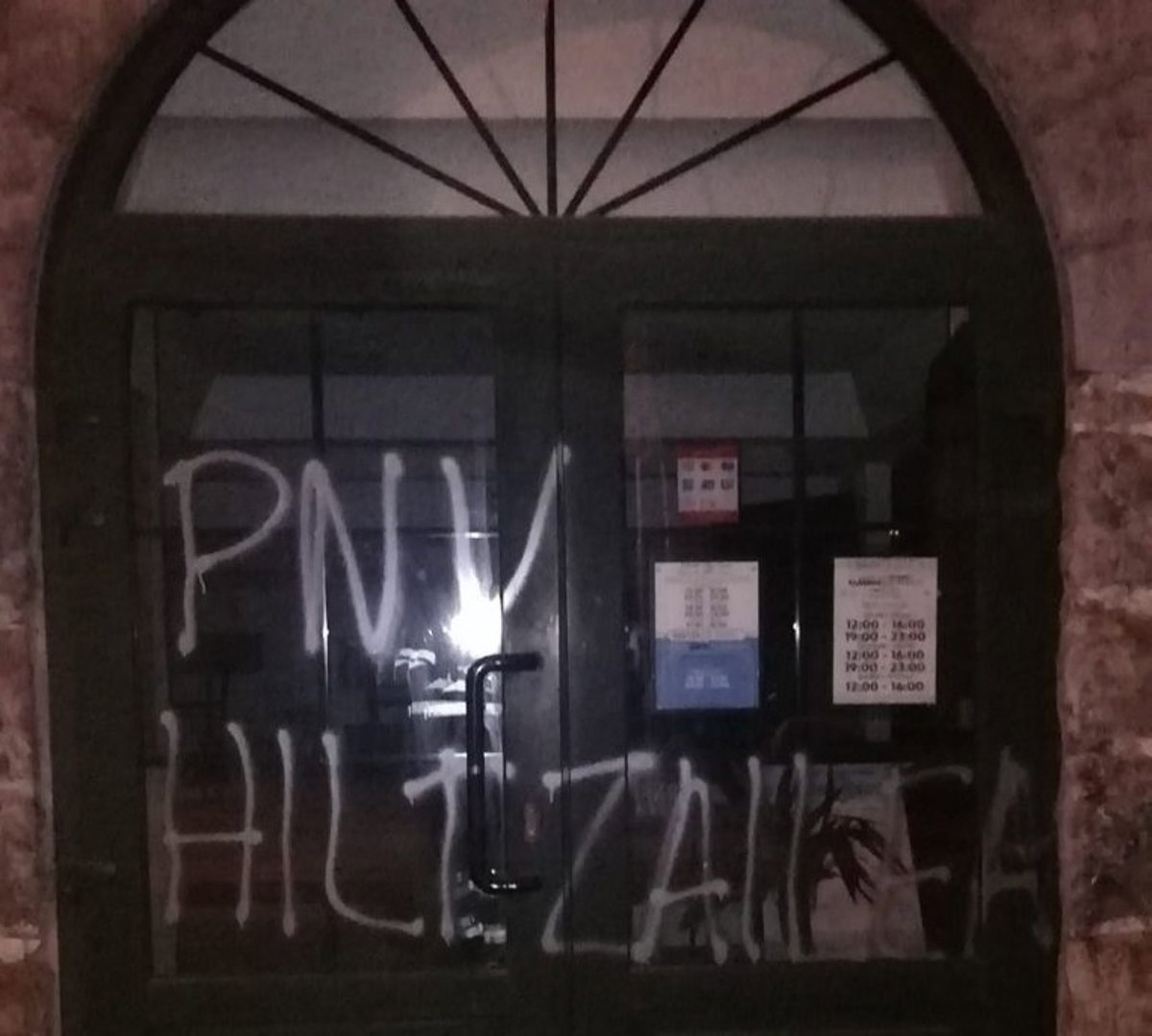 En un comunicado, el BBB del PNV ha explicado que la sede jeltzale y la casa consistorial han amanecido con pintadas en las que se insulta al alcalde de la localidad, Kolto Goitia, y al cuerpo del Ertzaintza, y se califica de "asesino" a EAJ-PNV.