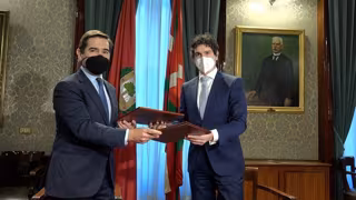 El diputado general de Bizkaia, Unai Rementeria y el presidente de BBVA, Carlos Torres Vila, han sido los encargados de firmar este lunes este protocolo en el Palacio foral en Bilbao.